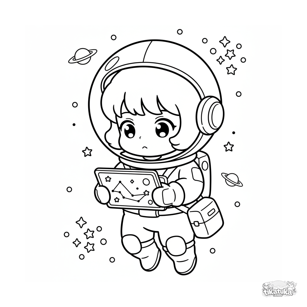 Página para colorear para niños 7-9: un joven explorador en el espacio exterior mapea las estrellas.