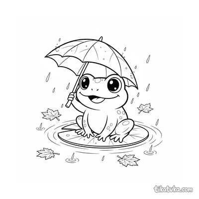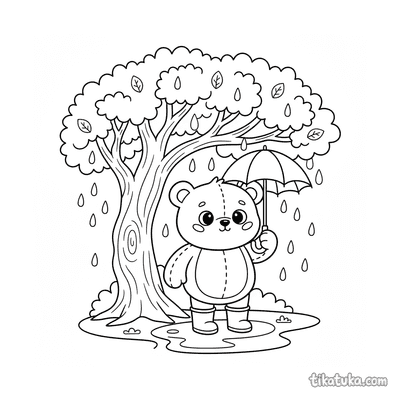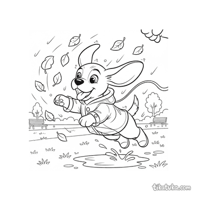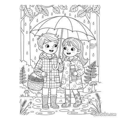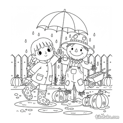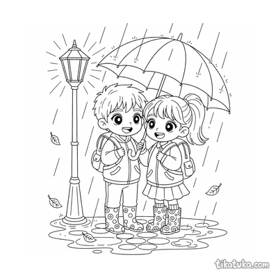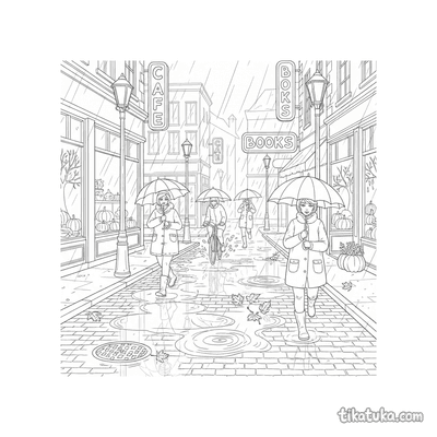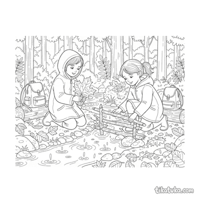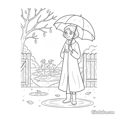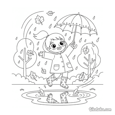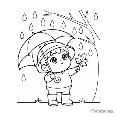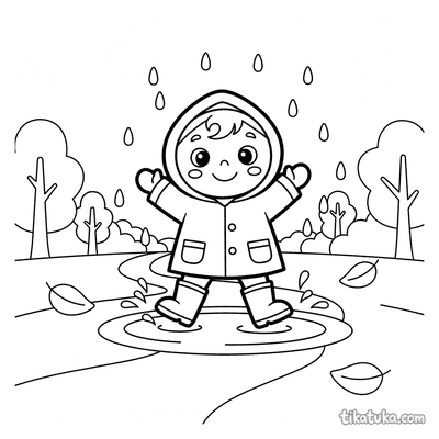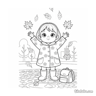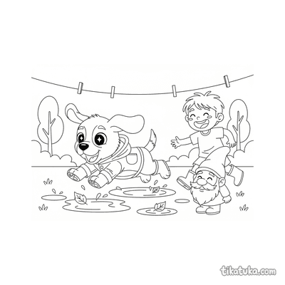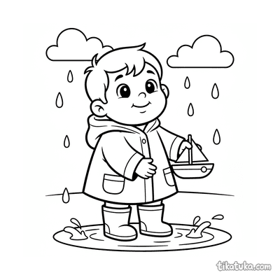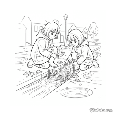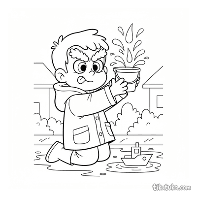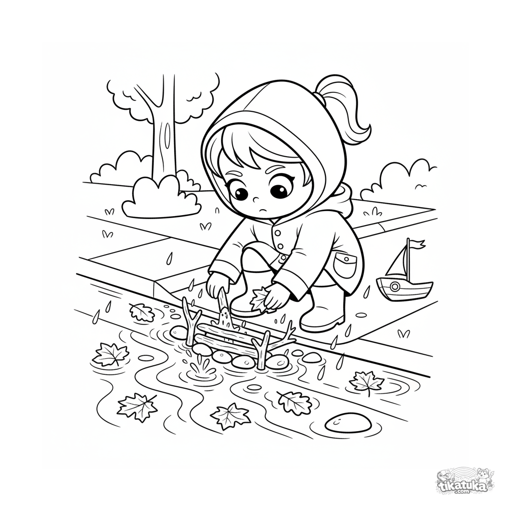 Página para colorear para preadolescentes 7-9: un niño con impermeable se concentra en construir una presa con palos y hojas en un arroyo de agua de lluvia en la calle. Escena con un barco de juguete y hojas de otoño.