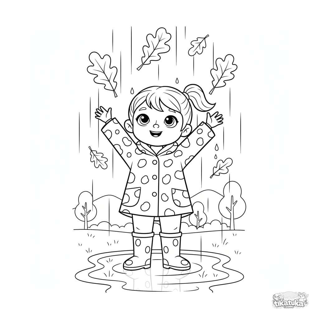 Página para colorear para niños de 4-6 años: un niño con impermeable y botas atrapa hojas de otoño bajo la lluvia. Detalle moderado, formas claras.