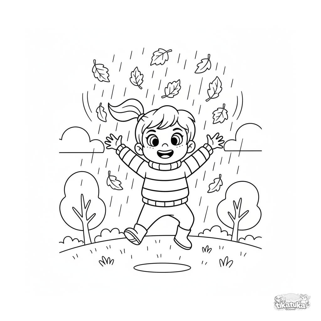 Página para colorear para niños de 4-6 años: un niño con botas salta alegremente, atrapando hojas de otoño que caen bajo la lluvia. Detalle moderado, pose dinámica.