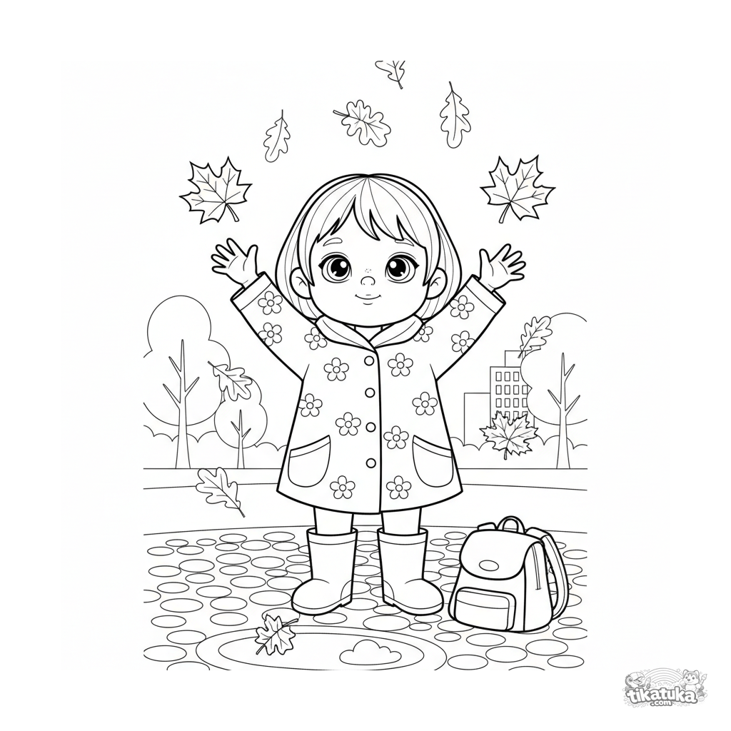 Página para colorear para niños de 4-6 años: un niño con impermeable y botas atrapa hojas que caen en un sendero del parque bajo la lluvia otoñal. Detalle moderado, formas claras.