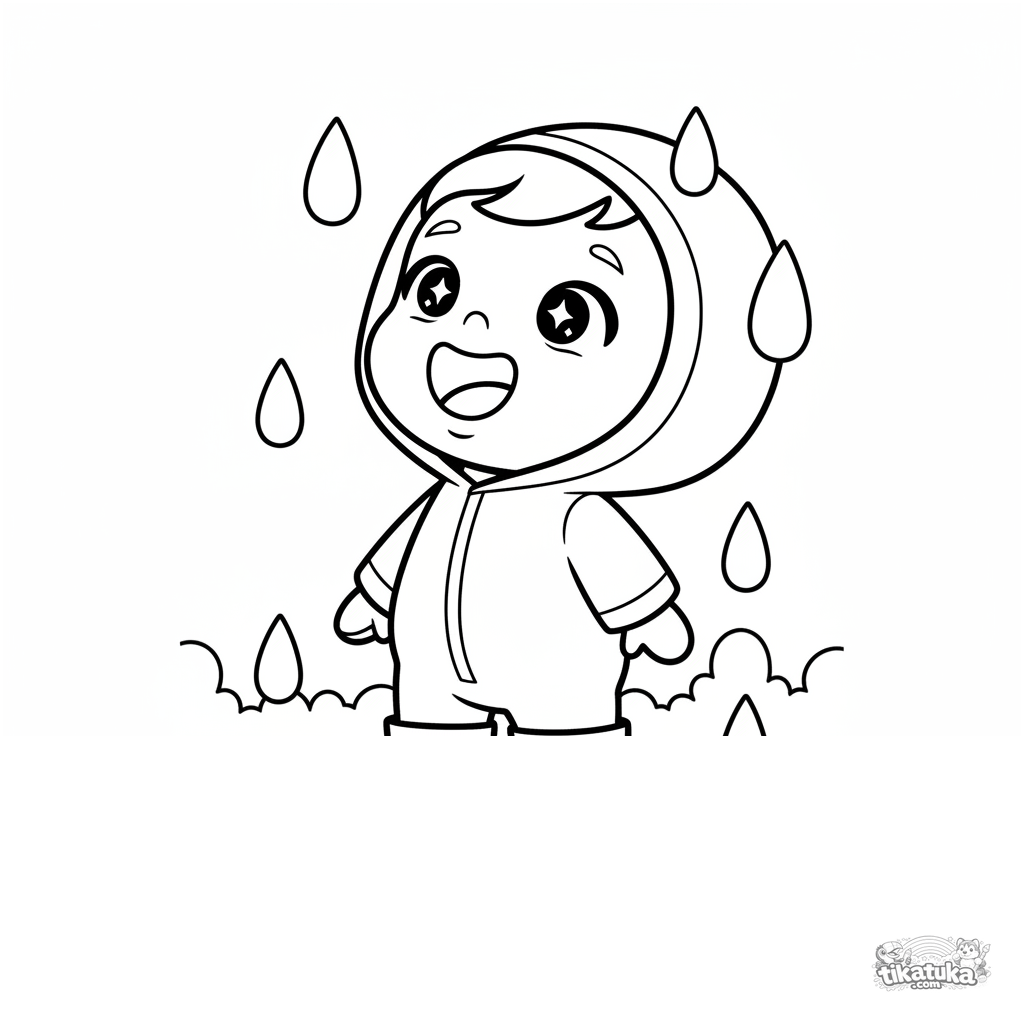 Página para colorear para niños de 2-3 años: un bebé divertido con traje de lluvia y botas atrapa gotas de lluvia de otoño con la lengua. Formas simples y grandes.