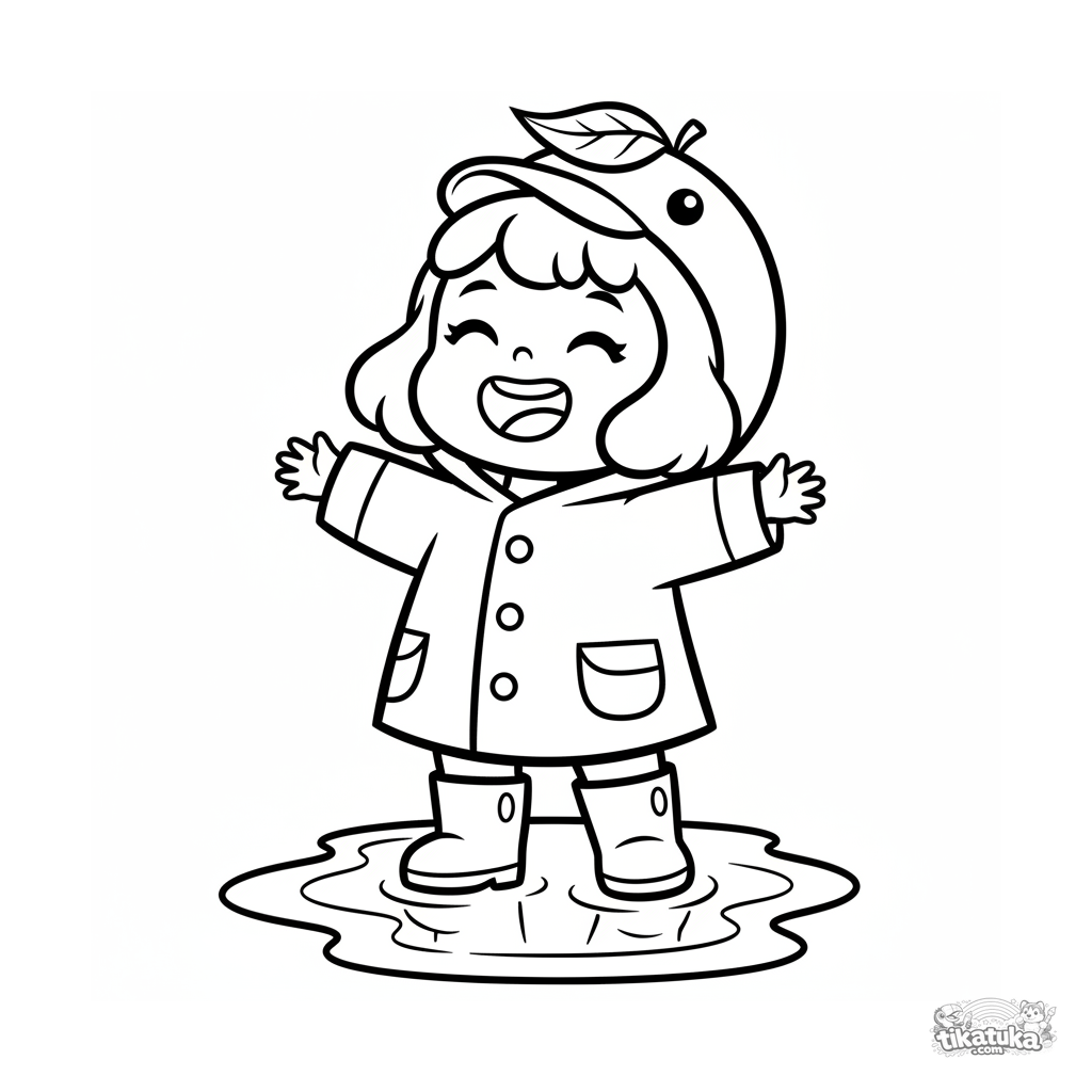 Página simple para colorear para niños pequeños 2-3 años: un niño con impermeable de pato atrapa gotas de lluvia. Áreas grandes y abiertas.