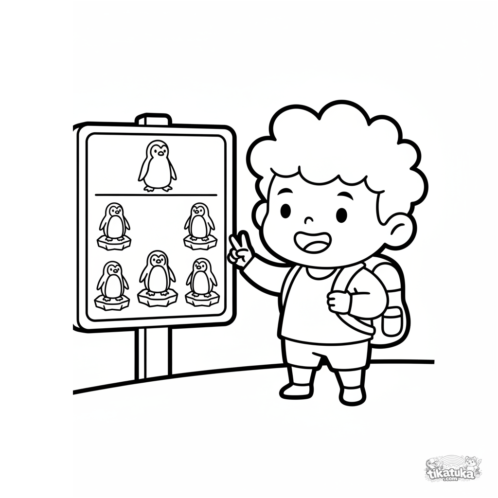 Página para colorear para bebés 2-3: un niño cuenta pingüinos en un cartel de hábitat en el zoológico. Formas simples, detalles grandes, aprender a contar.