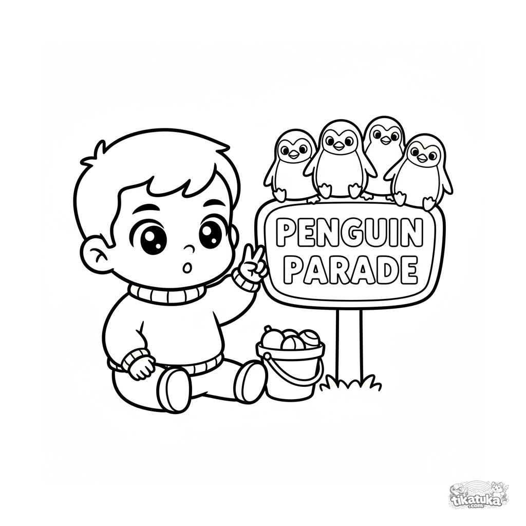Página para colorear para niños pequeños de 2-3 años: un niño cuenta pingüinos en un cartel del zoológico. Formas grandes y simples, detalles mínimos.