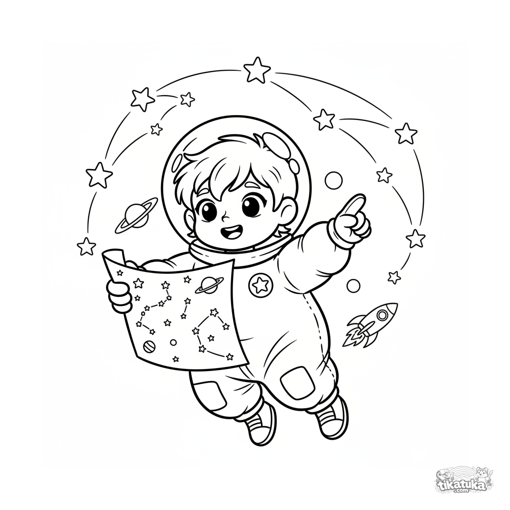 Página para colorear para 4-6 años: un niño con casco de burbuja flota en el espacio exterior, señalando alegremente las estrellas con un mapa de constelaciones.