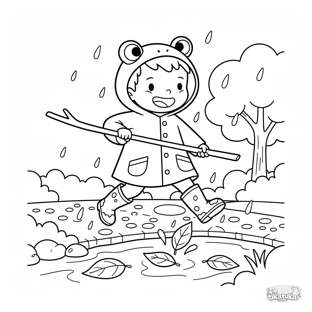 Página para colorear para niños pequeños de 2-3 años: un niño alegre con botas e impermeable de rana salta sobre un arroyo después de la lluvia. Formas muy simples y grandes.