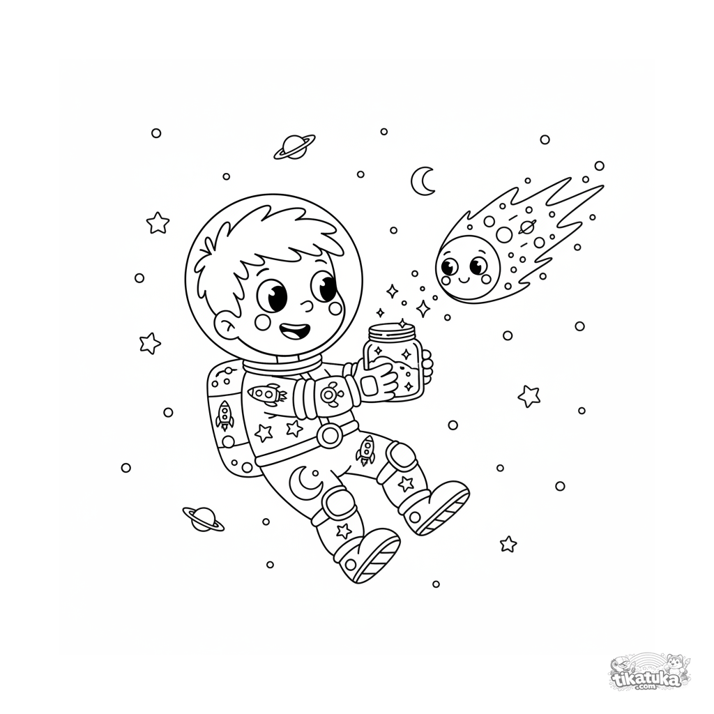 Página dinámica para colorear para preadolescentes 7-9 años: un niño en traje espacial atrapando polvo brillante de la cola de un cometa sonriente. Estilo divertido años 90, poses expresivas.