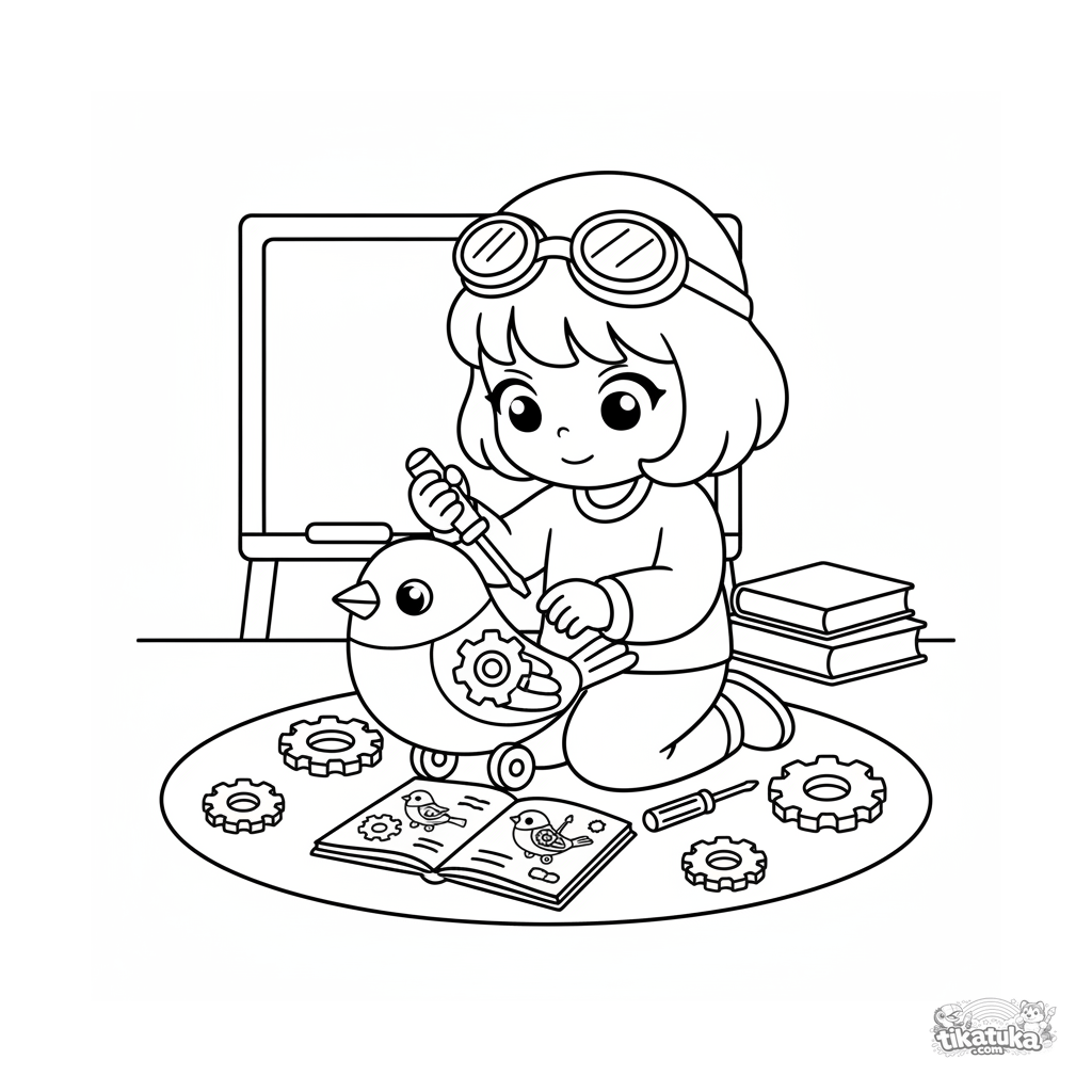 Página para colorear para niños pequeños 2-3: un niño inventor con gafas repara un juguete de cuerda en el suelo del aula. Formas simples y grandes.