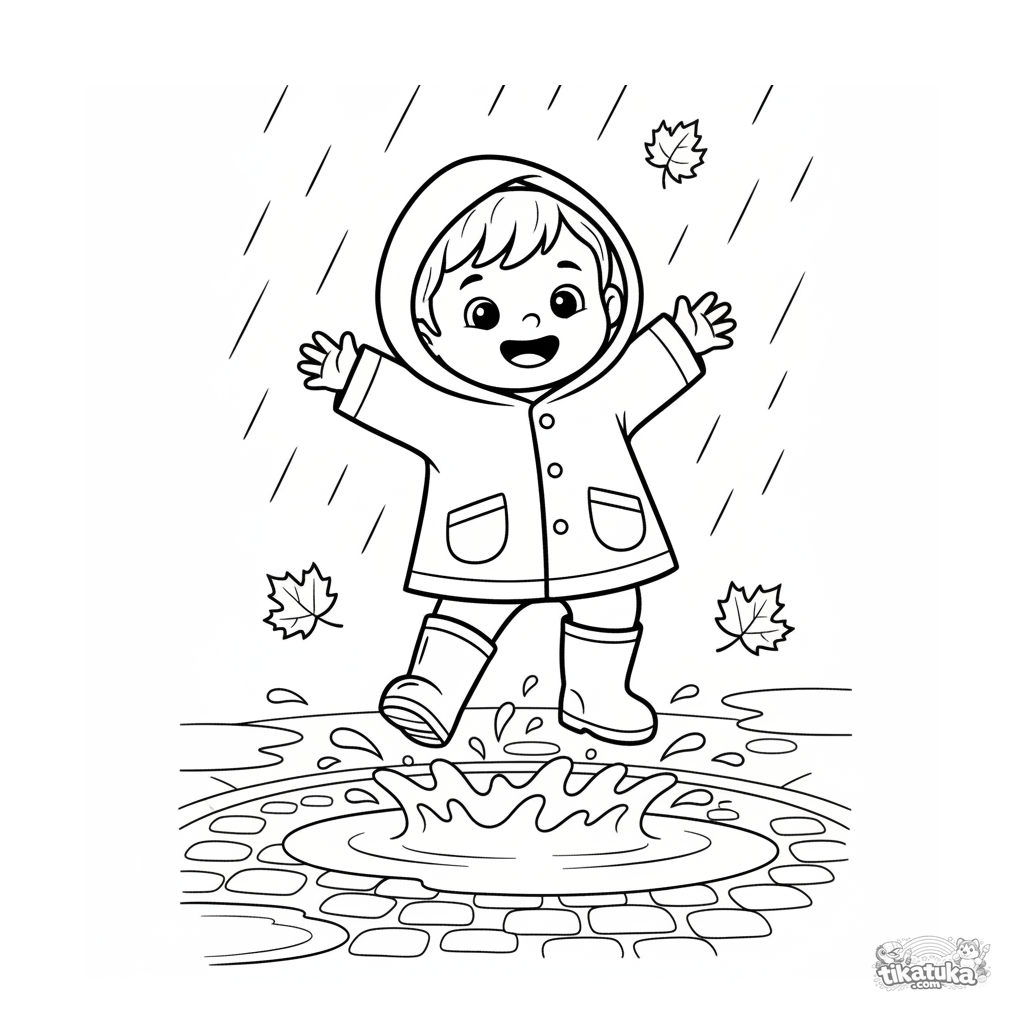 Página para colorear para niños pequeños de 2-3 años: un niño alegre con impermeable y botas salta en un charco de otoño. Contornos simples, áreas grandes para colorear.
