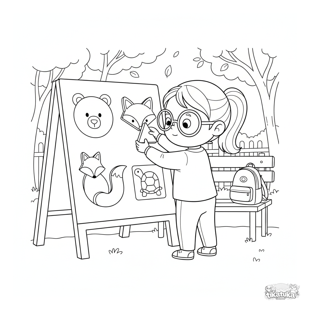 Página para colorear para niños de 7-9 años: un niño empareja formas con siluetas de animales en un tablero educativo. Detalle moderado.