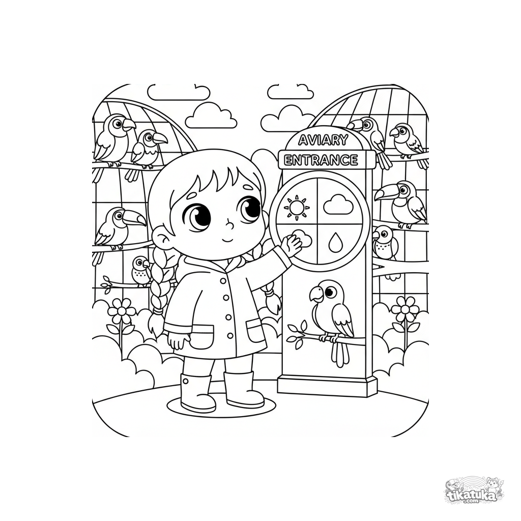 Página para colorear para preadolescentes de 7-9 años: un niño leyendo una rueda del tiempo en la entrada del aviario del zoológico. Escena educativa sobre meteorología.