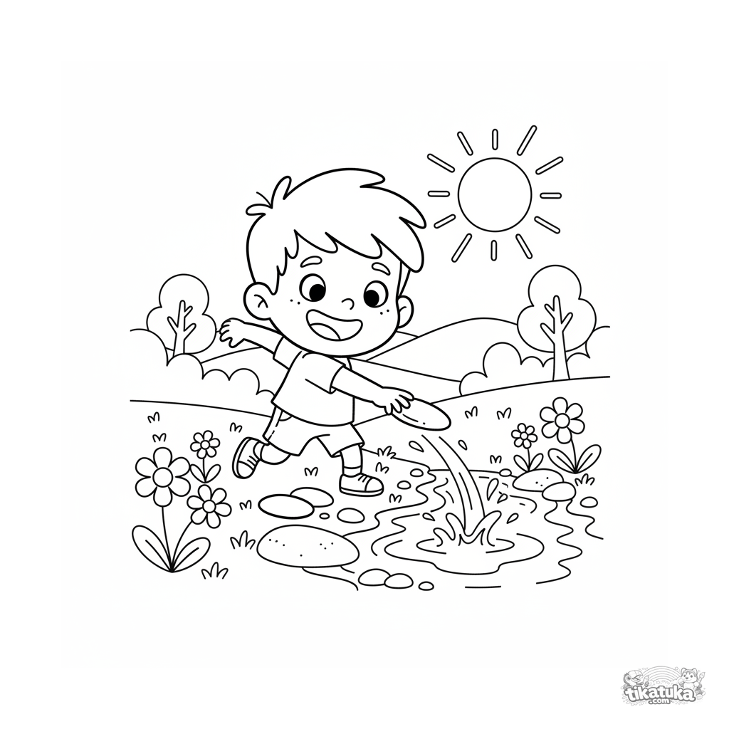 Página para colorear para 7-9 años: un niño alegre hace rebotar una piedra plana sobre la superficie de un arroyo soleado. Escena dinámica y alegre al aire libre.