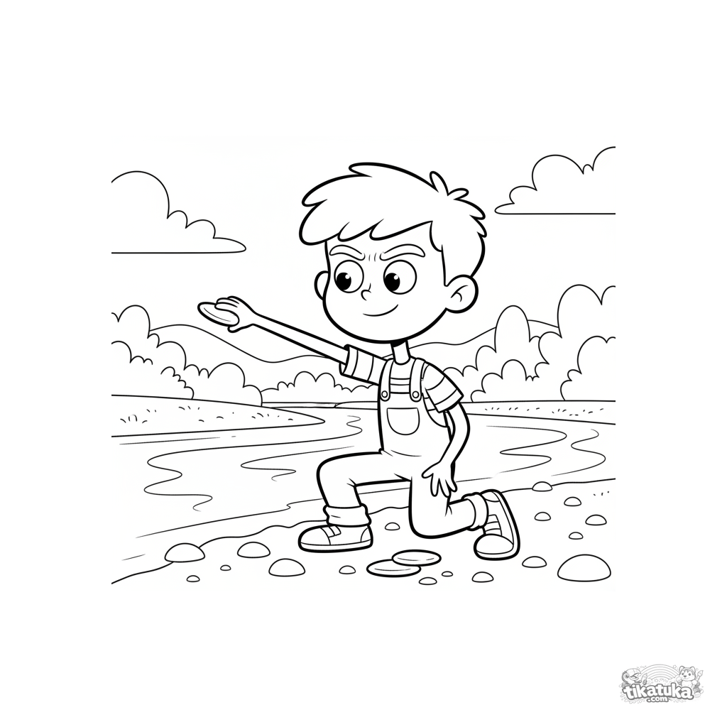 Página para colorear para 7-9 años: un niño feliz lanzando piedras sobre la superficie de un arroyo. Escena activa al aire libre.
