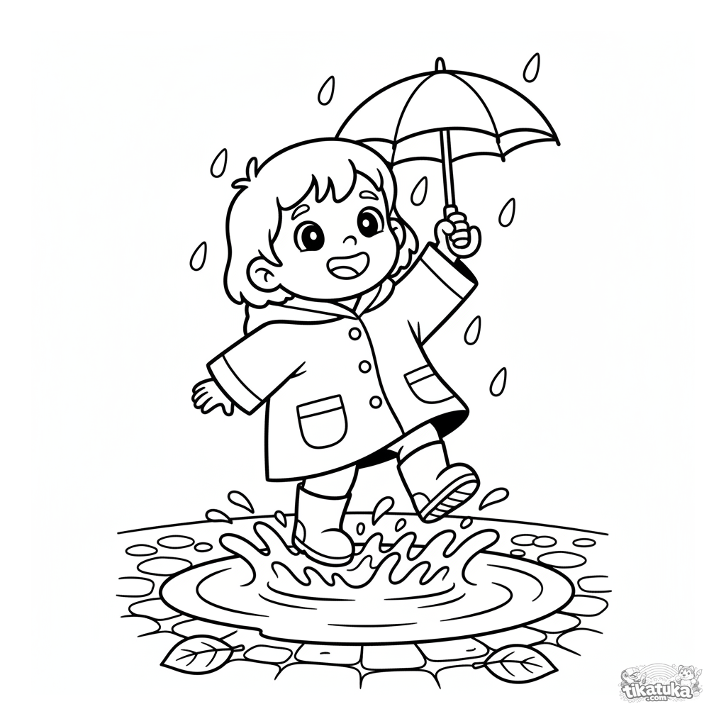 Página para colorear para niños pequeños de 2-3 años: un niño alegre con impermeable y botas salta en un charco de otoño bajo la lluvia. Formas grandes y simples.