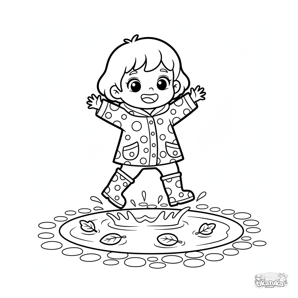 Página para colorear para niños de 2-3 años: un niño alegre con botas de goma salta en un charco de otoño. Contornos simples, detalles grandes.