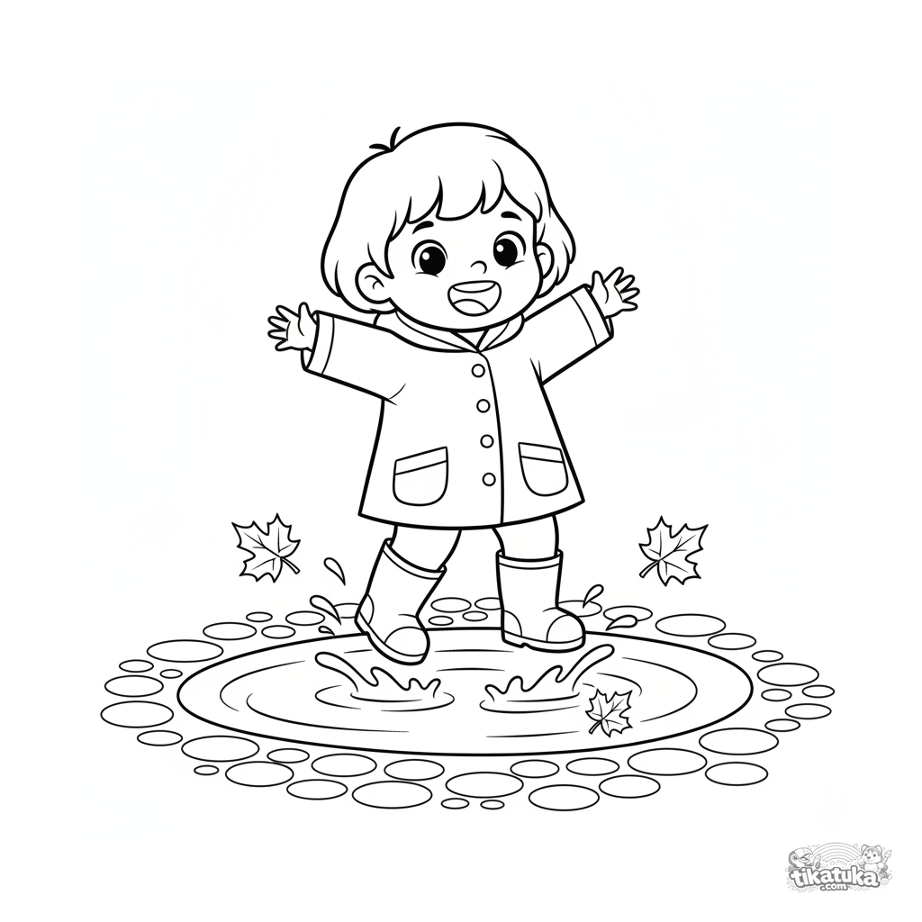 Página para colorear para niños pequeños de 2-3 años: un niño alegre con impermeable y botas salta en un charco de otoño. Formas simples, amplios márgenes.