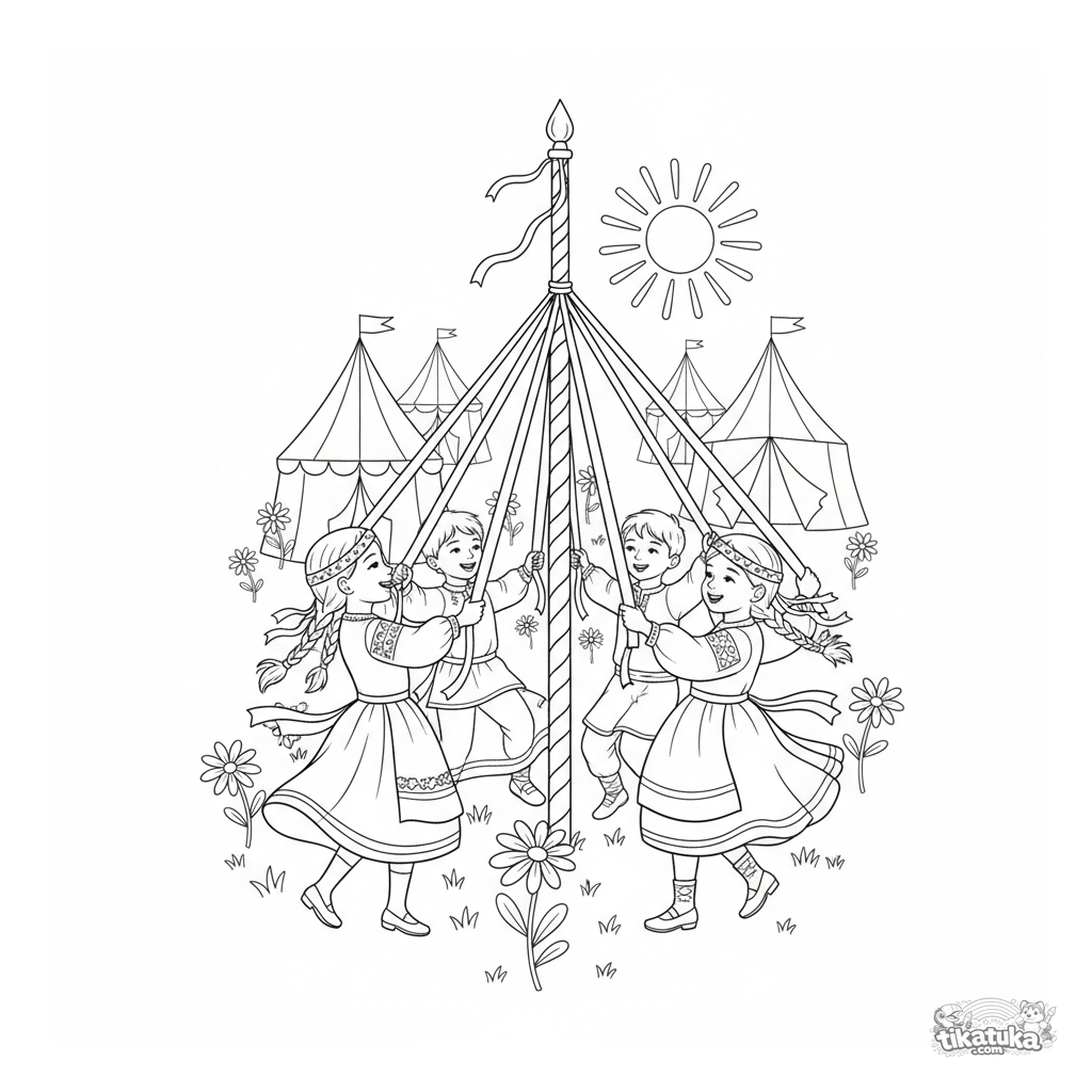 Página para colorear para niños 4-6 años: niños felices en trajes folclóricos bailan con cintas alrededor de un árbol de mayo. Escena folclórica brillante.