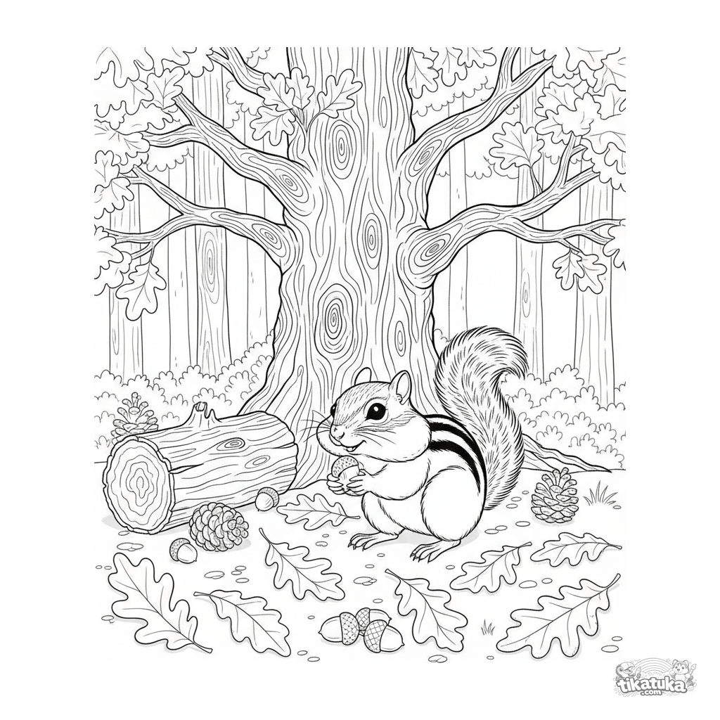 Página para colorear de naturaleza otoñal para niños de 4 a 6 años. Una ardilla listada con las mejillas llenas recoge bellotas bajo un viejo roble.