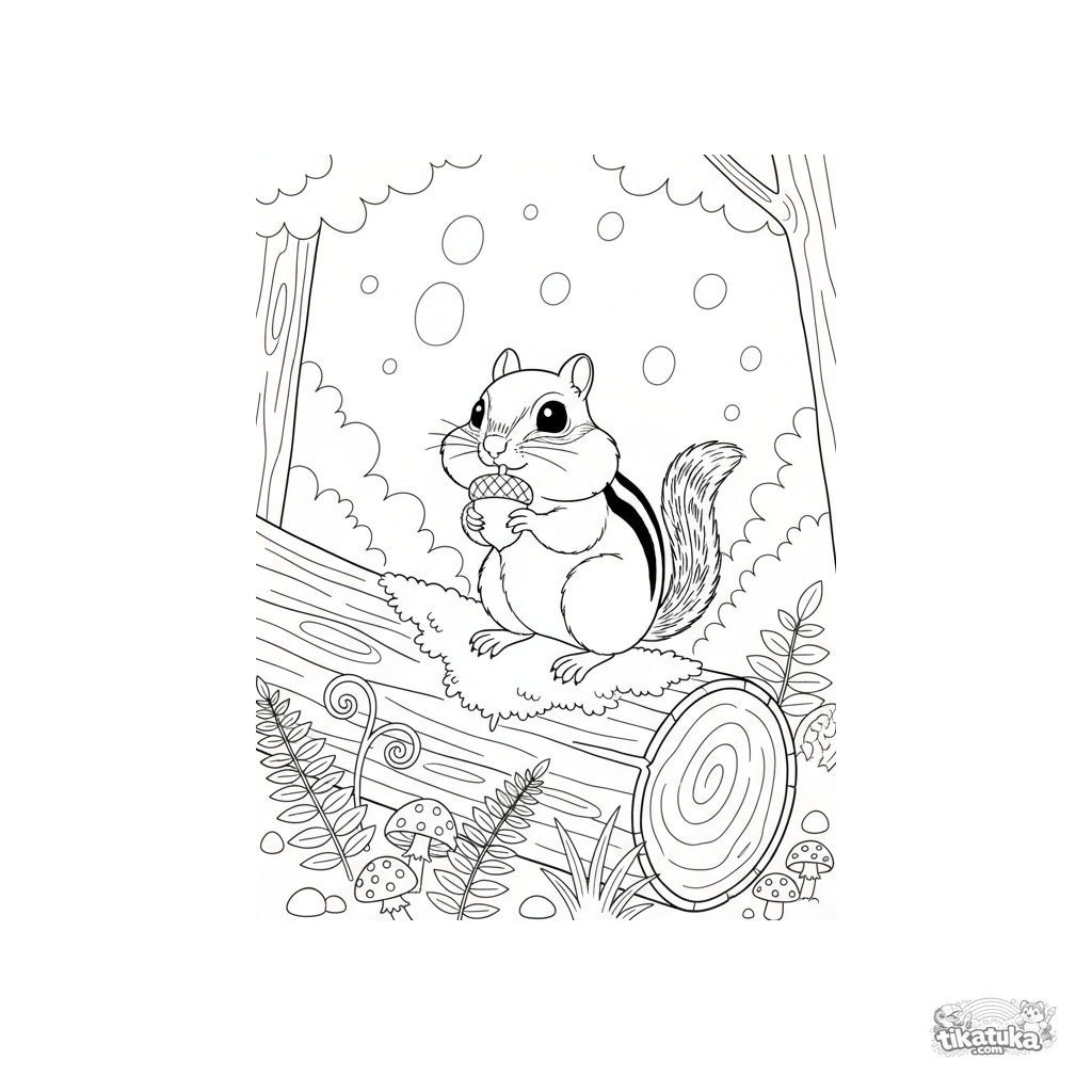 Página para colorear de una ardilla listada con una bellota en un tronco musgoso. Para niños de 4 a 6 años. Escena natural detallada.