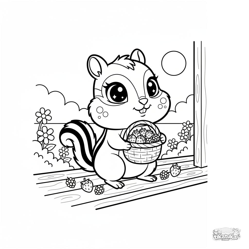 Página para colorear linda para niños: una ardilla listada con una cesta de bayas en la barandilla de un porche de verano. Estilo chibi, ojos grandes.
