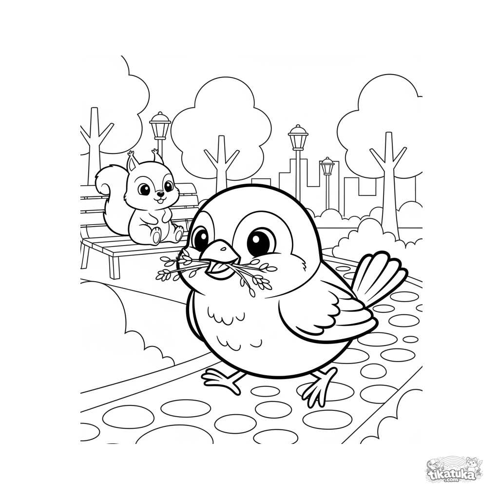 Página para colorear: un gorrión recogiendo ramitas para su nido en un parque urbano. Ideal para niños de 4 a 6 años.