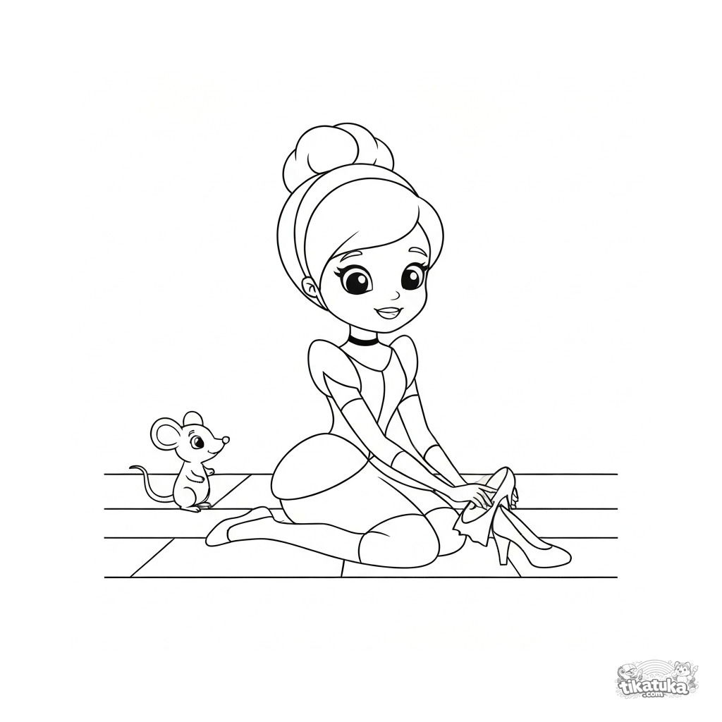 Página para colorear para niños. Cenicienta sentada en el suelo puliendo su zapatilla de cristal con un paño, un ratoncito mira cerca. Descarga gratis.