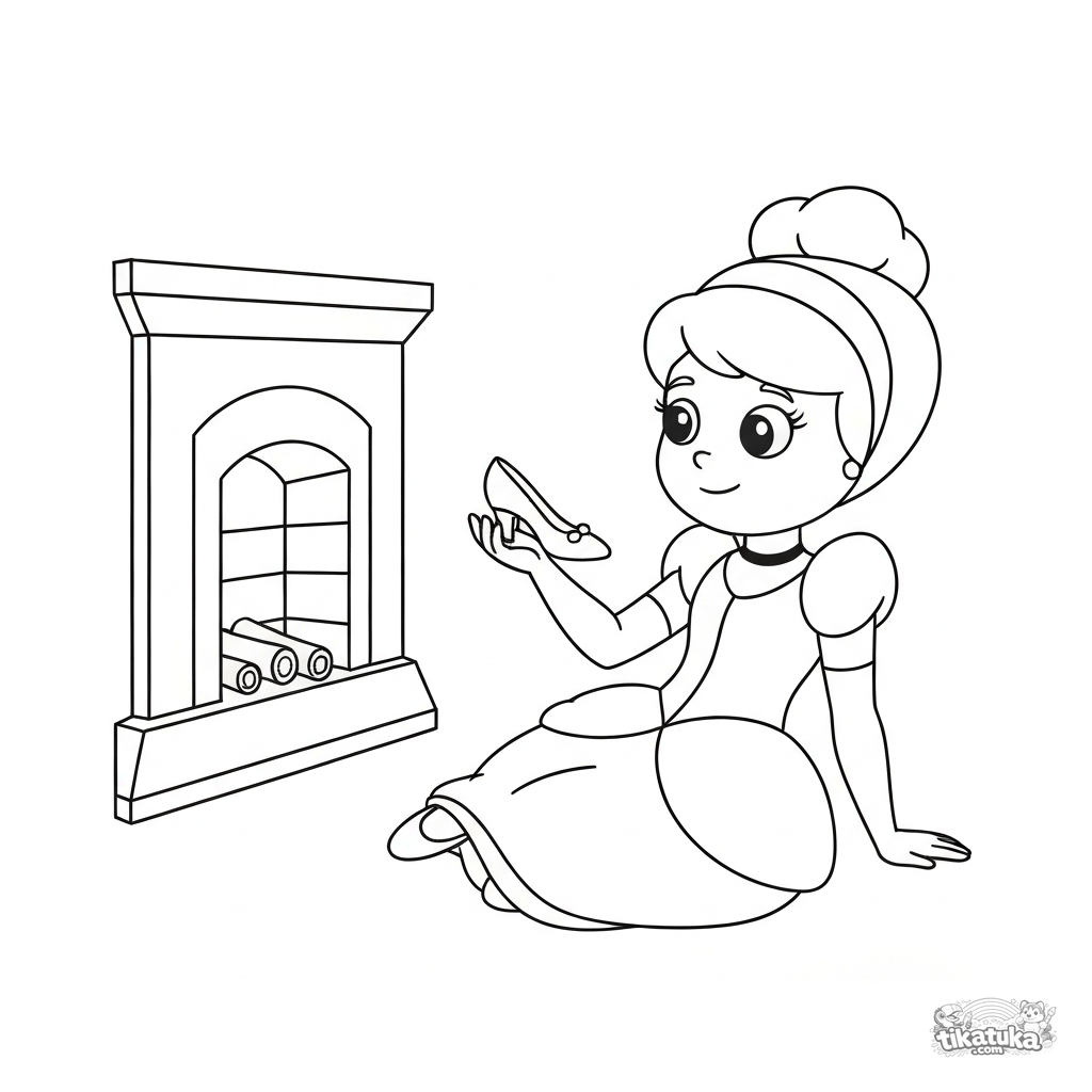 Página para colorear para niños. Cenicienta sentada junto a la chimenea con su zapato de cristal. Contornos simples para pequeños. Descarga gratis.