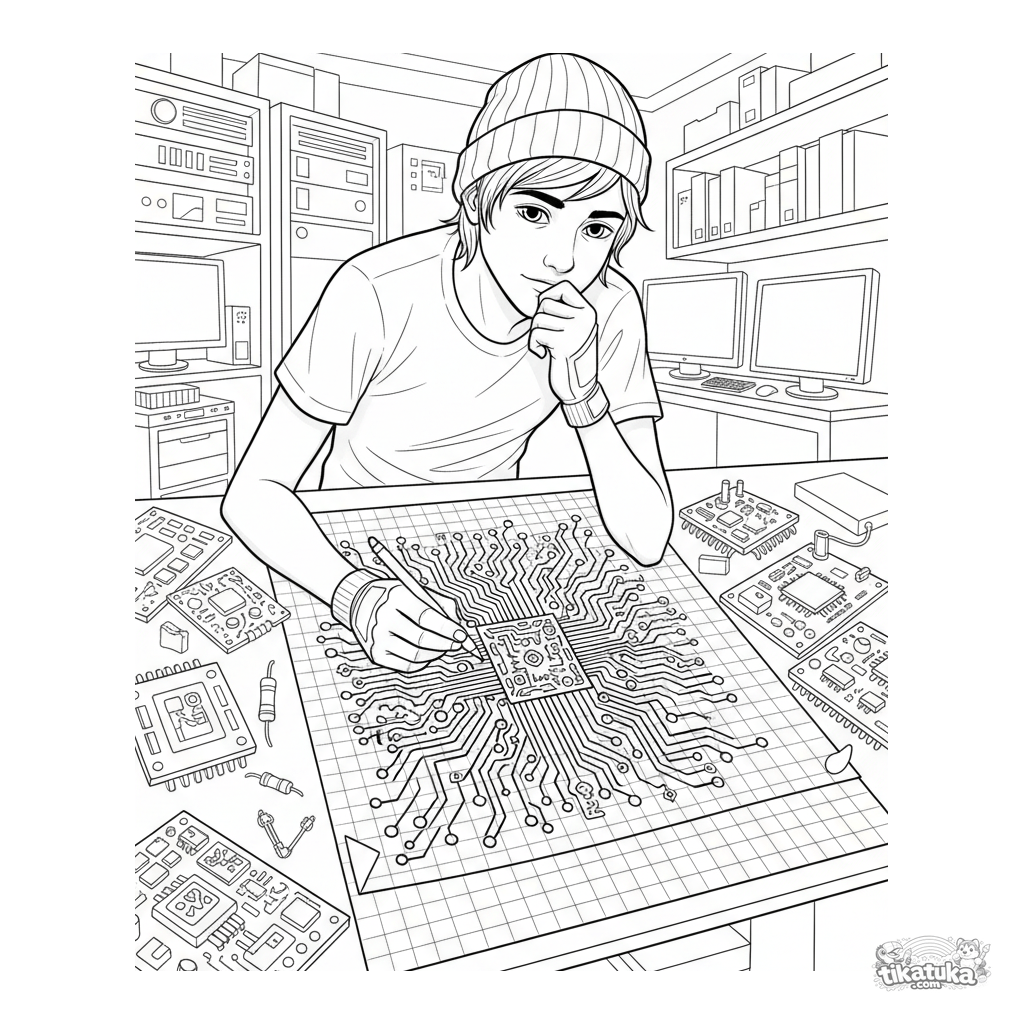 Página para colorear para niños de 10-12 años: un artista diseña una placa de circuito en un sótano de hackers. Detalles: mesa de dibujo, componentes dispersos, papel cuadriculado, objetos de inspiración.