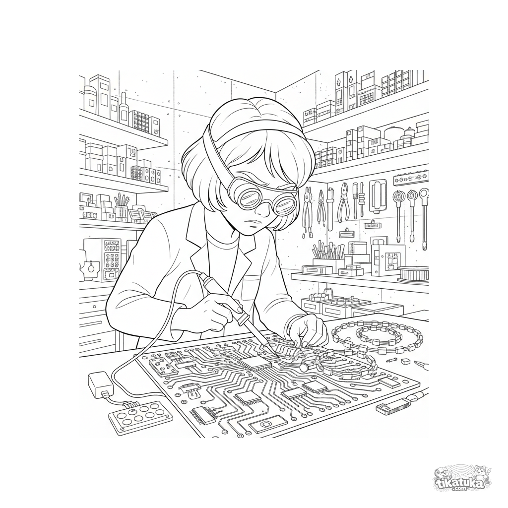 Página para colorear para niños de 10-12 años: un adolescente artista crea una obra de arte con LED en una placa de circuito, soldando cuidadosamente componentes en un sótano de hackers bien equipado.