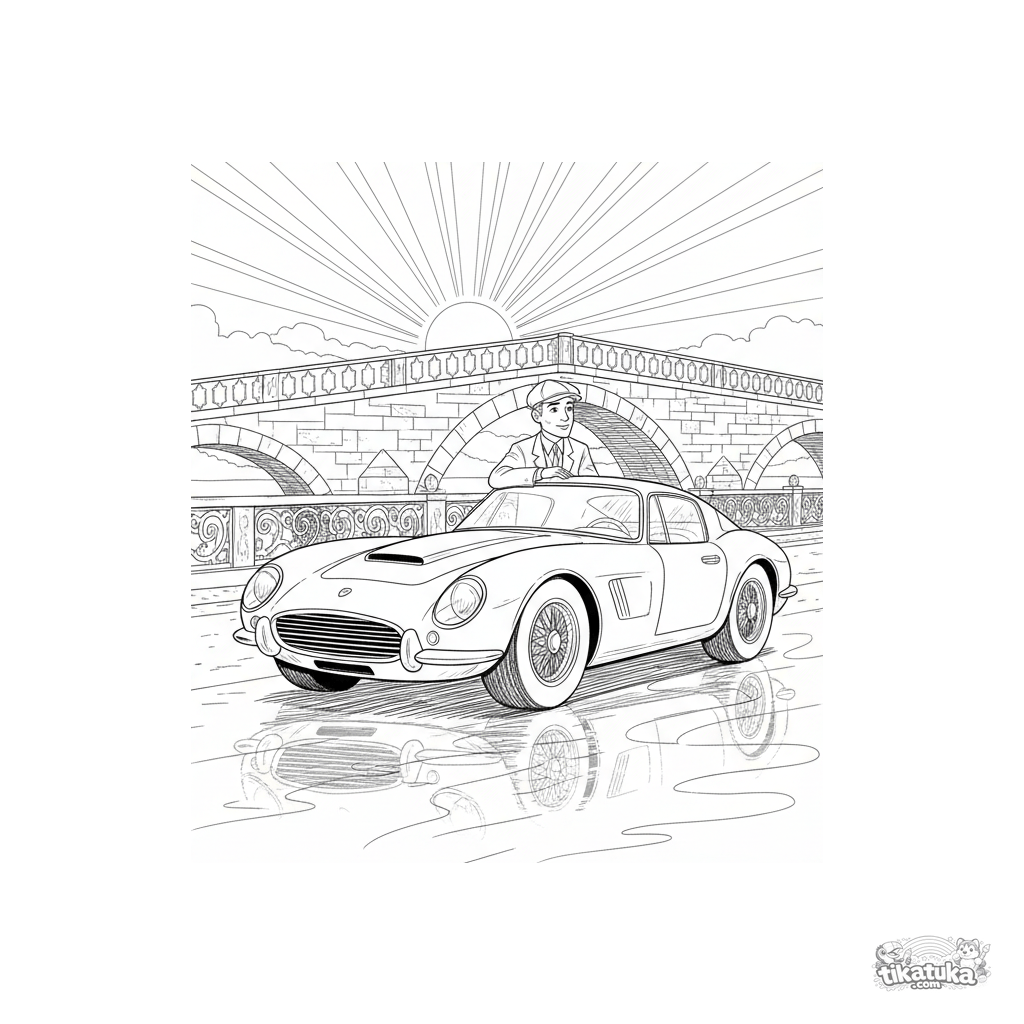 Página para colorear compleja y hermosa para 10-12 años: un coche deportivo clásico en un puente al atardecer. Escena detallada en estilo grabado vintage.