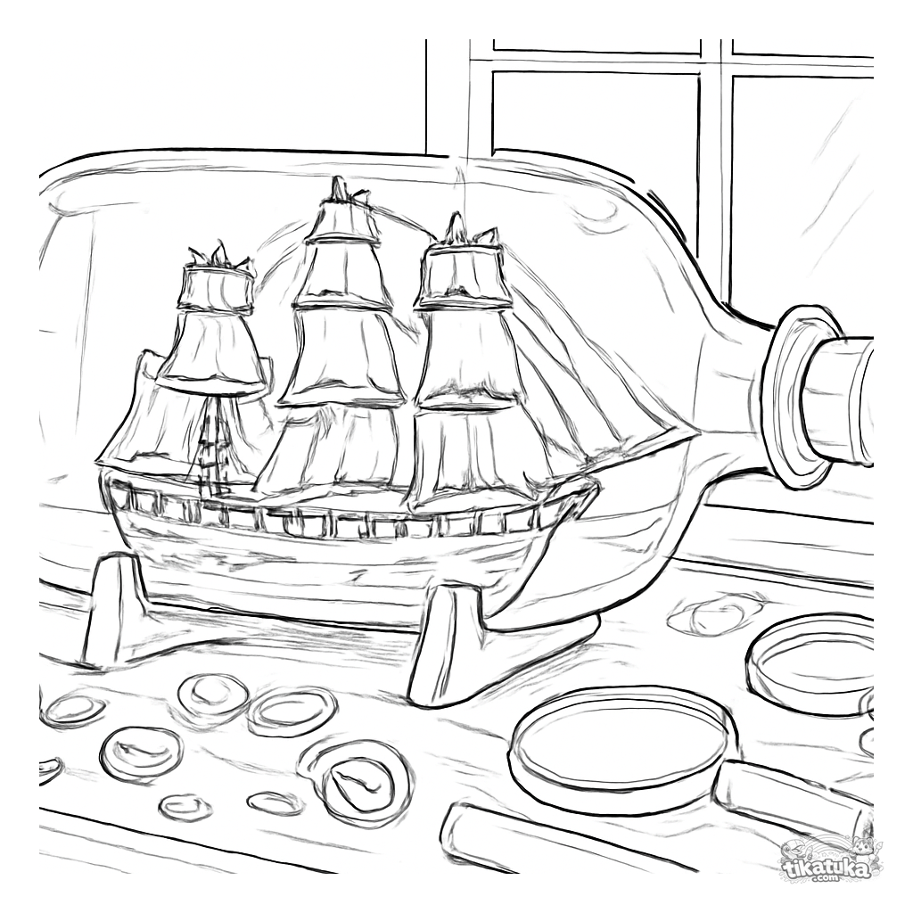 Página para colorear de un modelo detallado de velero de madera en una botella sobre un banco de trabajo. Para niños de 8 a 12 años. Escena realista con herramientas y mapa.
