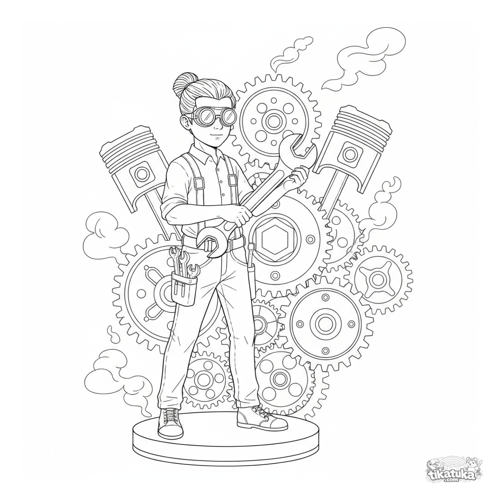 Página compleja estilo grabado para niños de 10-12 años: un ingeniero ajustando un mecanismo de engranaje gigante en un laboratorio de vapor.