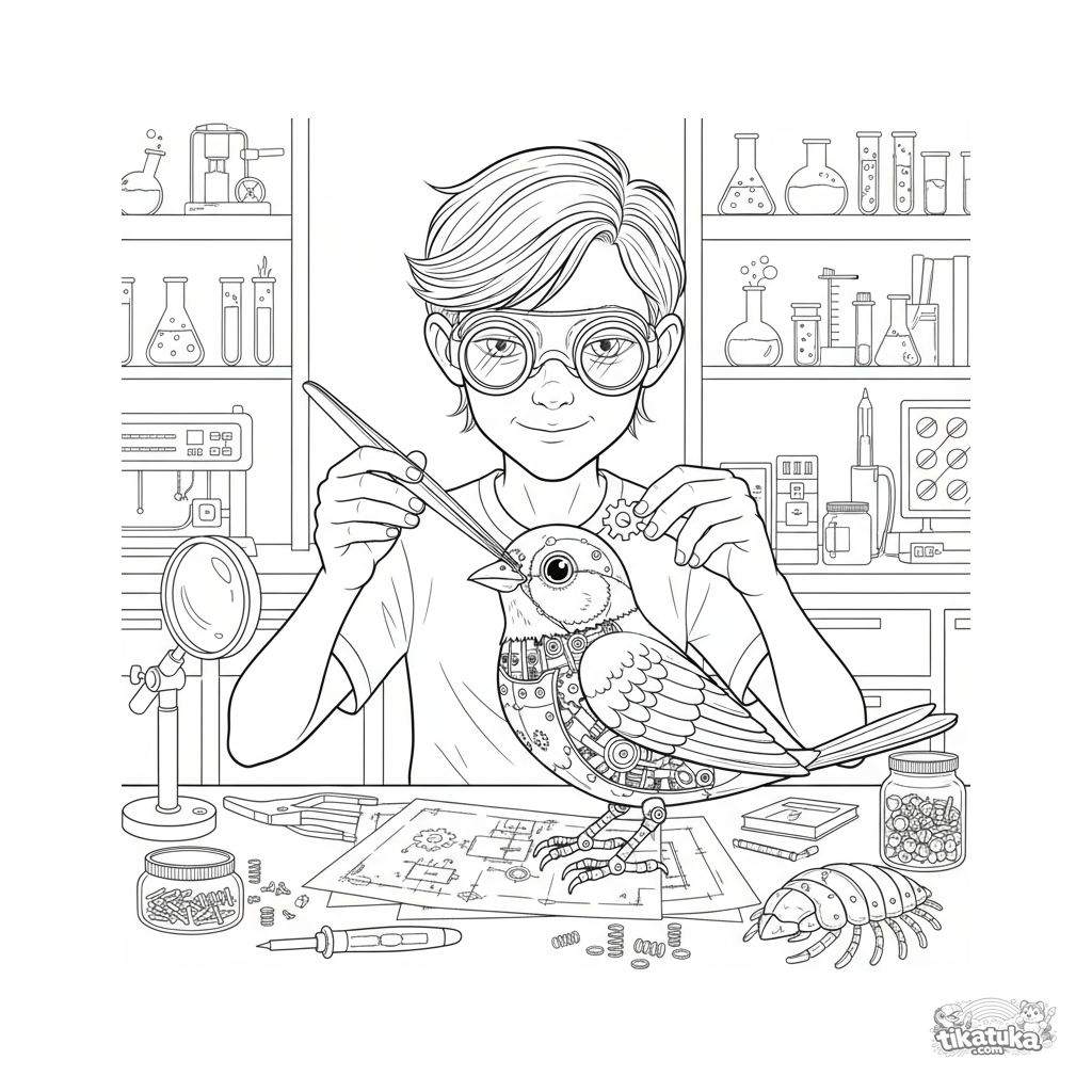 Página para colorear para niños 10-12: un joven relojero en un laboratorio secreto ensambla un complejo autómata pájaro mecánico. Escena detallada con engranajes y herramientas.