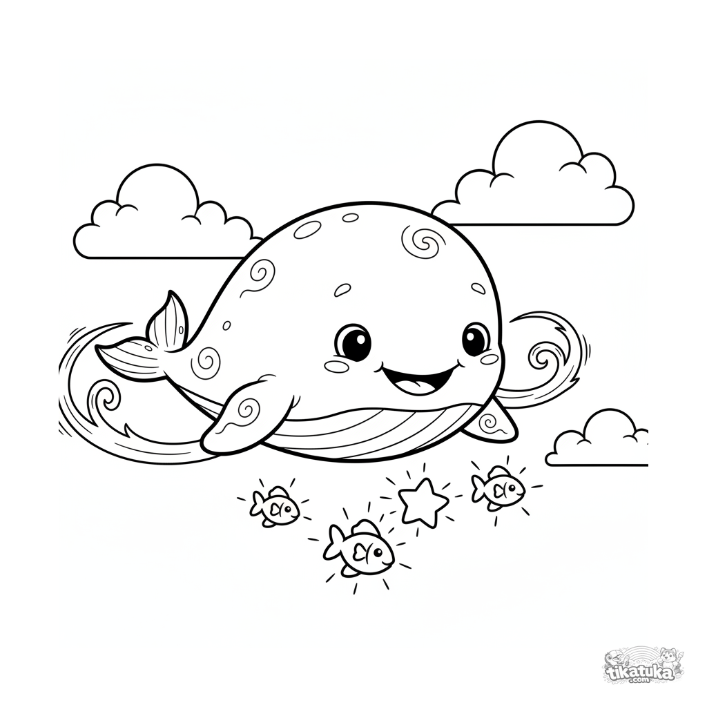 Página simple para colorear para niños de 2-3 años: una ballena de nubes jugando con peces estrella. Formas grandes y simples.