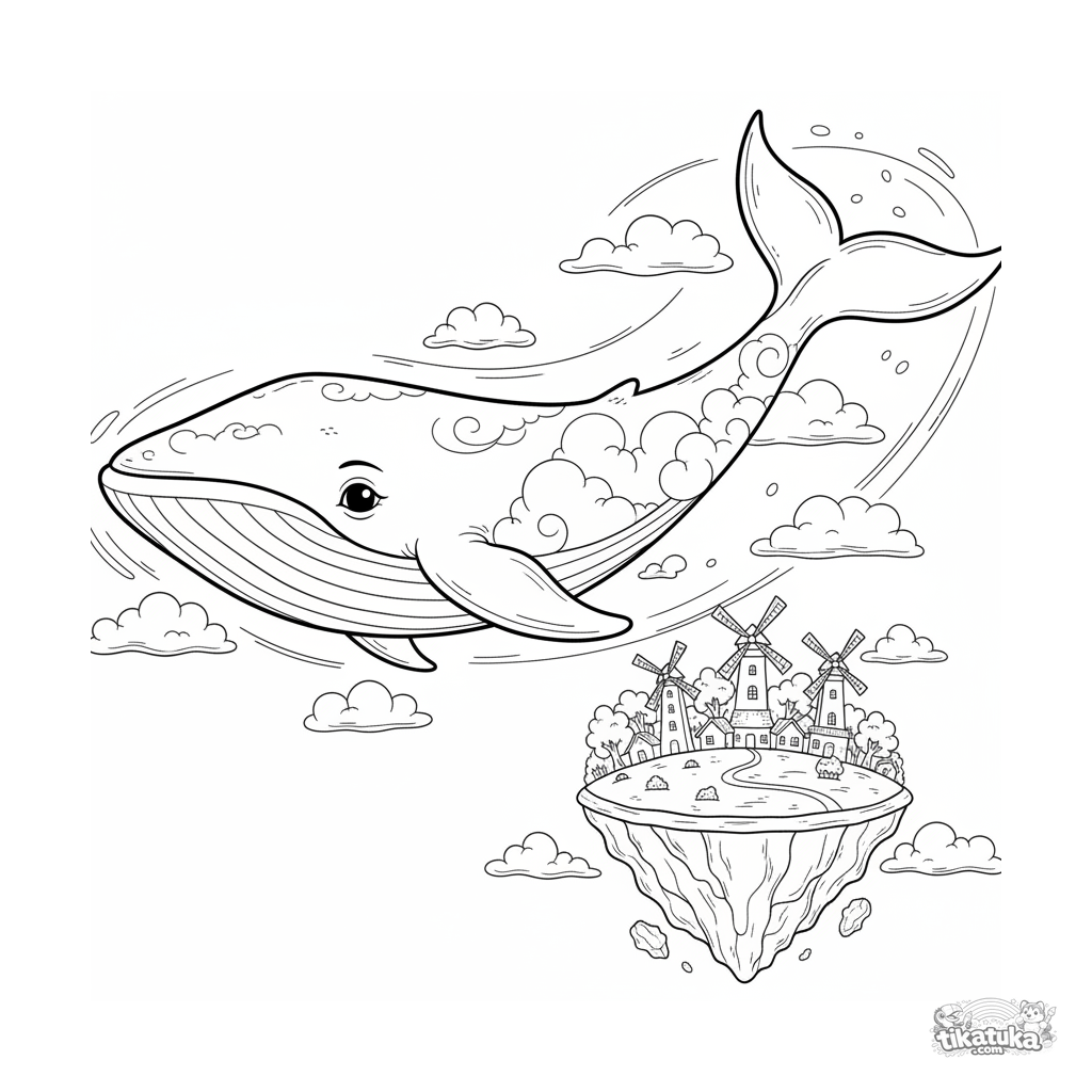 Página detallada para colorear para niños 10-12: una majestuosa ballena de nubes nada sobre un pueblo en una isla flotante. Escena de fantasía intrincada.