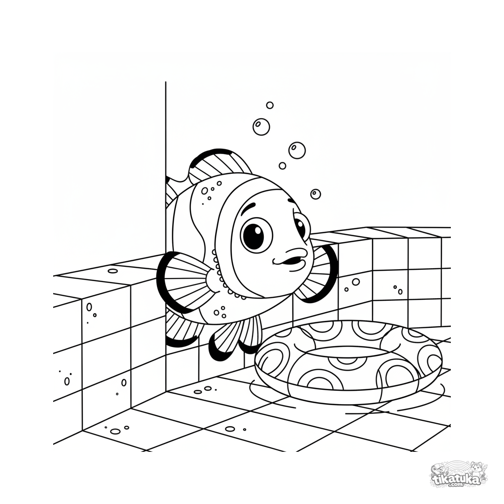 Página realista detallada para colorear para niños de 10-12 años: un pez payaso a rayas asoma desde una esquina de la piscina junto a un aro inflable. Líneas anatómicas precisas.