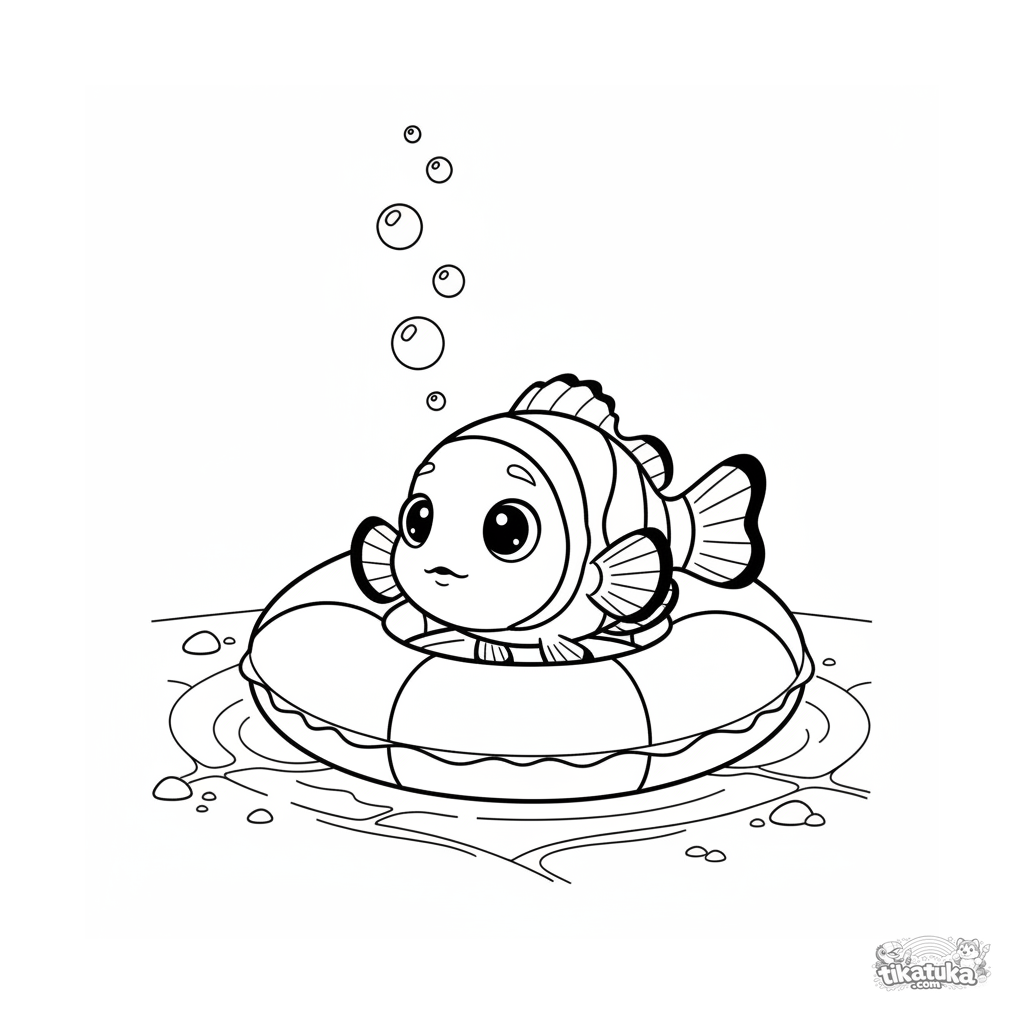 Página para colorear para niños 7-9: un pez payaso asoma tímidamente desde un aro en el fondo de la piscina. Formas suaves, escena tierna.
