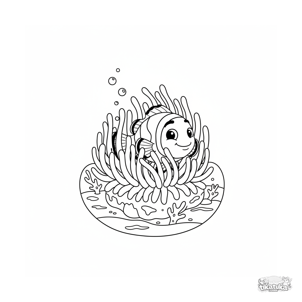 Divertida página para colorear estilo años 90: pez payaso asomándose desde una anémona en un arrecife soleado. Para niños de 4 a 6 años.