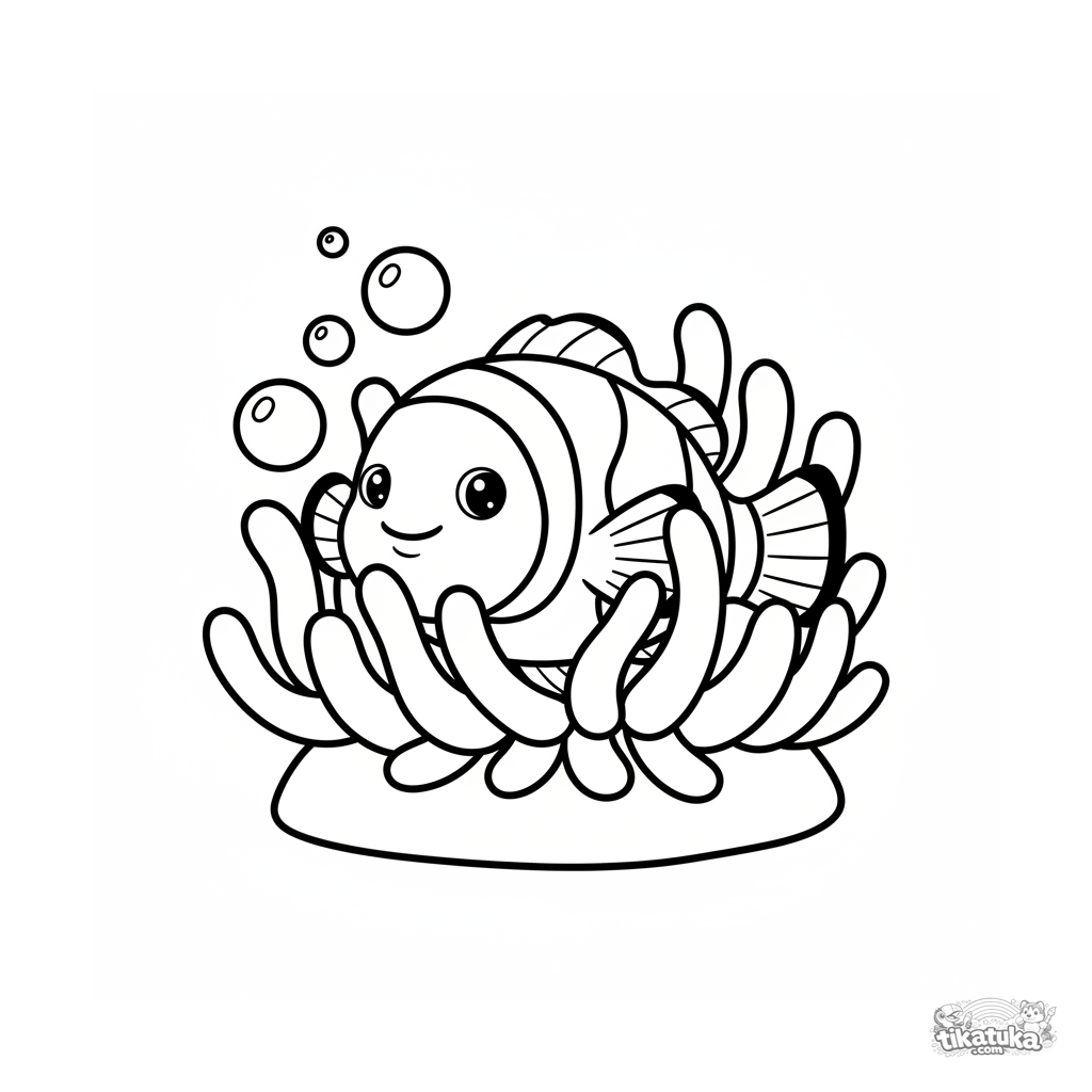 Página para colorear simple para niños de 2-3 años: un pez payaso asomándose de una anémona en una roca soleada.