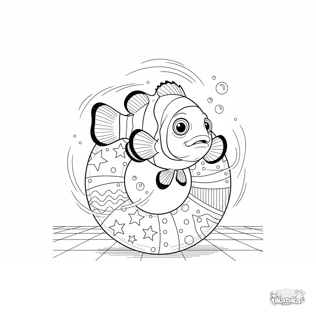 Página para colorear dinámica de un pez payaso nadando rápido por el agujero de un flotador. Para niños de 10 a 12 años.