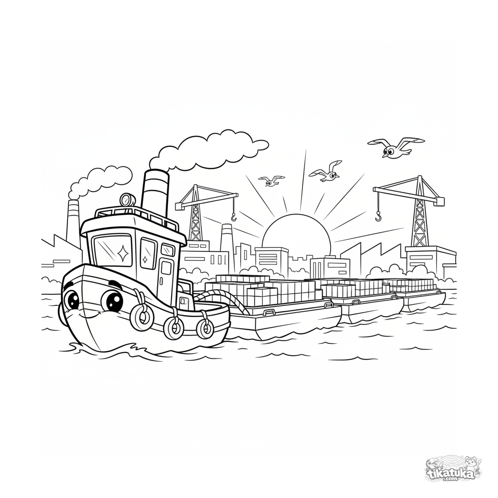 Página para colorear para 7-9 años: un remolcador con chimenea empuja barcazas cargadas en un puerto al atardecer. Gaviotas, cuerdas, escena de trabajo detallada.