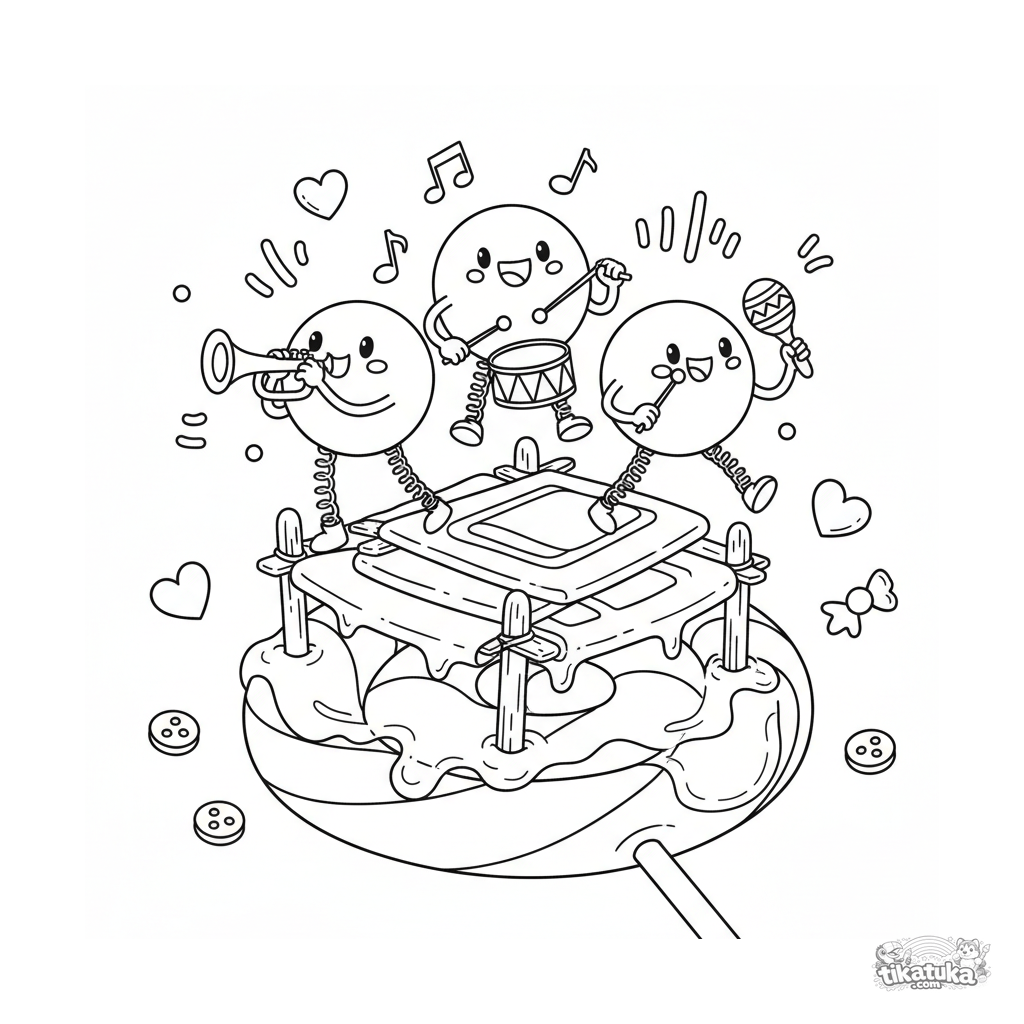 Página para colorear para niños 4-6: un grupo alegre de microbios toca instrumentos en una piruleta. Formas retro divertidas, varios personajes.