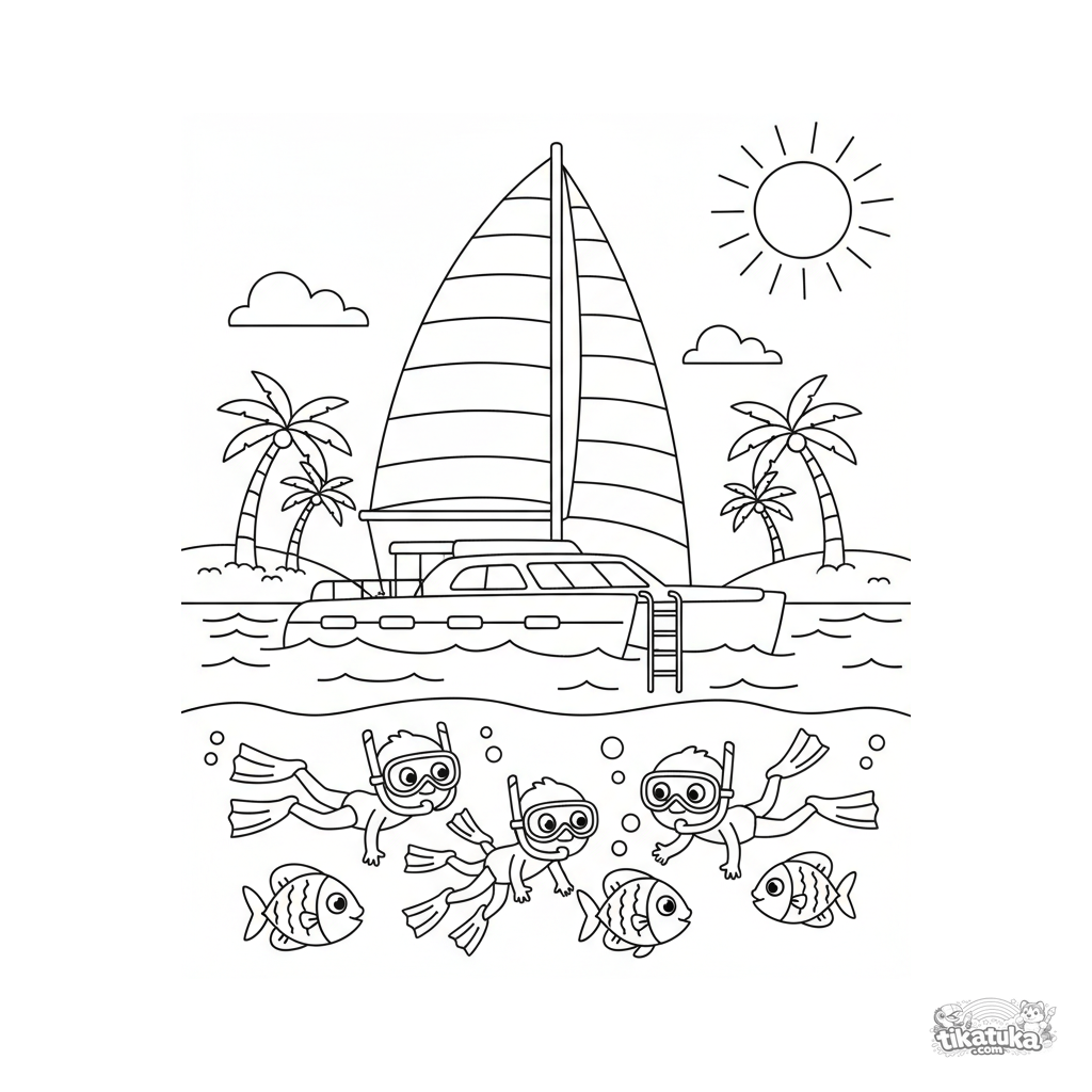 Página para colorear para 7-9 años: un colorido catamarán está anclado en una bahía tropical. Buceadores nadan explorando el coral. Escena soleada.