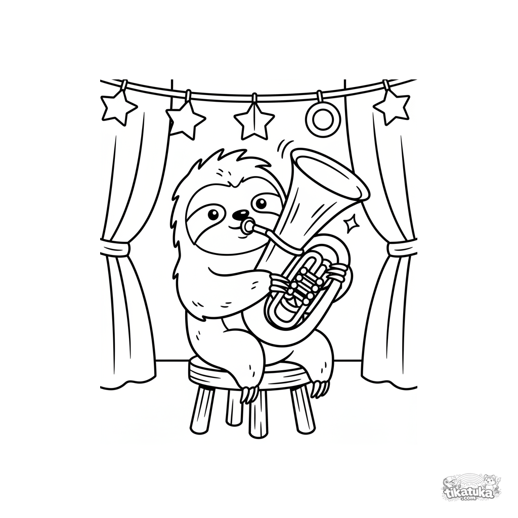 Página para colorear para niños: un perezoso tocando la tuba en un escenario escolar. Escena divertida y sincera con decoraciones.