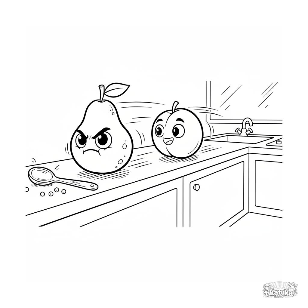 Página para colorear para 7-9 años: una divertida carrera al estilo cómic entre una pera y una ciruela por la encimera de la cocina. Poses dinámicas, detalle moderado.