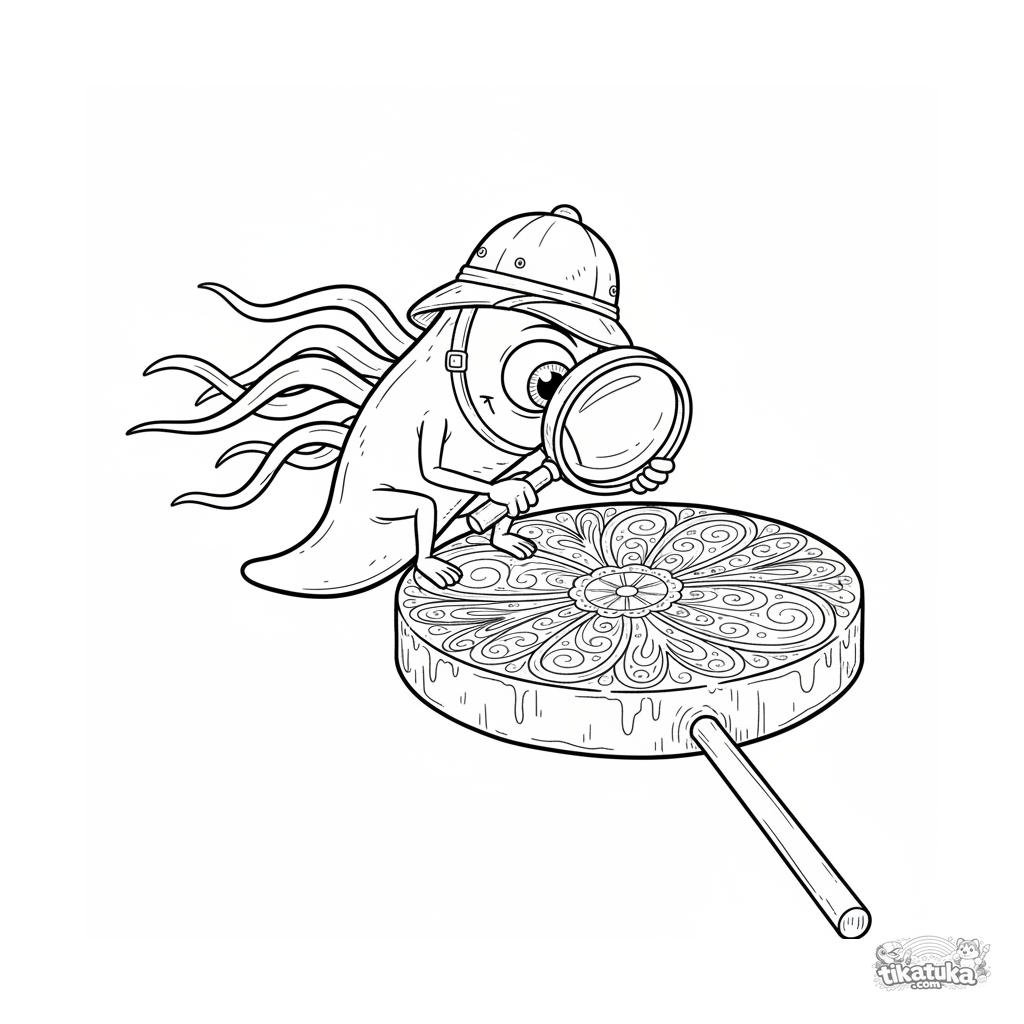 Página detallada para colorear para niños mayores 10-12: un microbio con forma de coma explora los patrones de una piruleta. Estilo realista y científico.