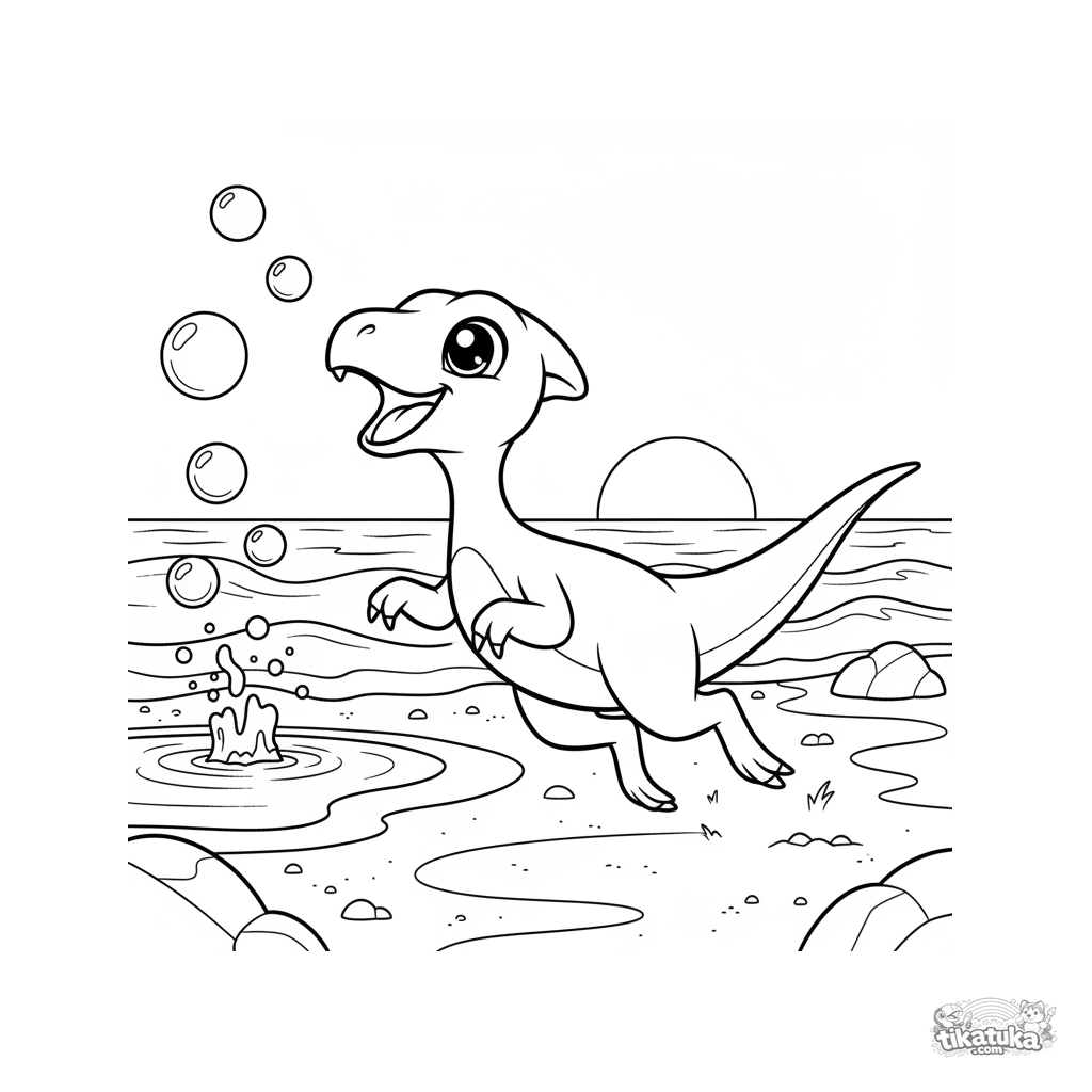 Página para colorear de un pequeño compsognathus persiguiendo burbujas en la arena mojada de una playa antigua. Para 7-9 años. Estilo anime, escena dinámica.