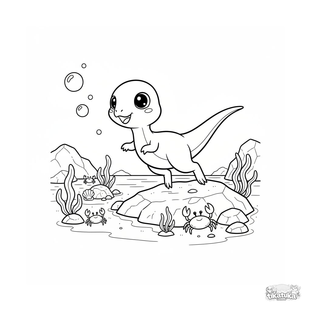 Página divertida para colorear para 4-6 años: un pequeño dinosaurio compsognathus persiguiendo felizmente burbujas de aire entre rocas en la marea baja de una playa antigua.
