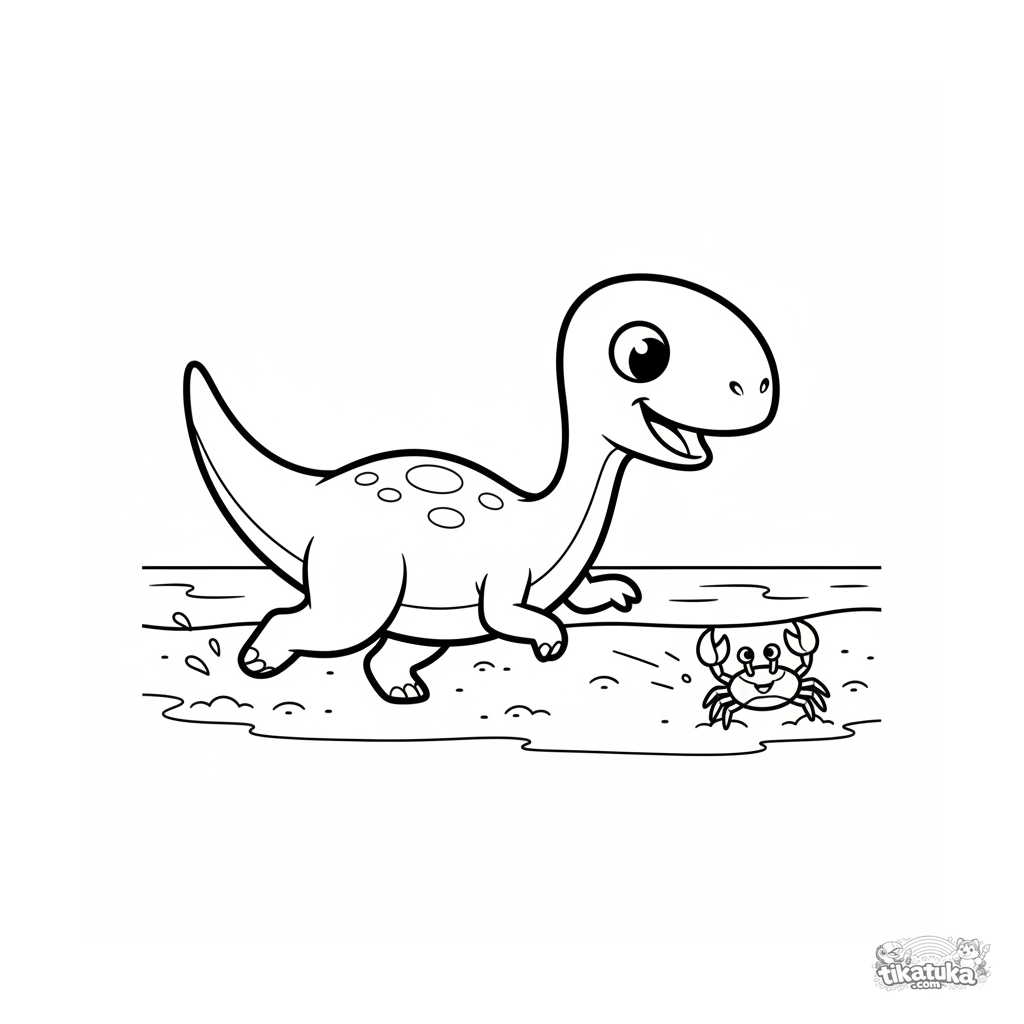 Página simple para colorear para niños pequeños 2-3 años: un pequeño compsognathus corre por la arena mojada de una playa antigua, persiguiendo un cangrejo.